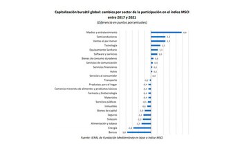 1 - Medios y Entretenimiento: que pasó de 2,4% en 2017 a 7,3% en 2021, un aumento de 4,9 puntos porcentuales.