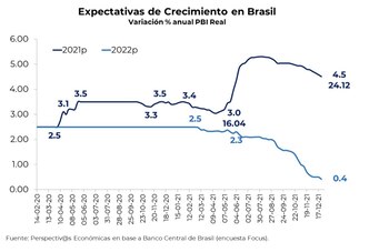 Ahora bien, en 2022 es probable que los precios de las materias primas agrícolas sigan siendo favorables (aunque menores a los de 2021), pero está en duda si el clima acompañará a la producción. En el caso de Brasil, no se espera que pueda crecer al ritmo que lo hizo este año, a lo que se suman algunas dudas e interrogantes sobre la campaña electoral presidencial que repercuten negativamente en las ya de por sí pobres proyecciones de crecimiento (de hecho, hoy las previsiones son de una expansión casi nula, de apenas 0,4 por ciento).