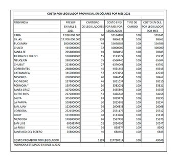 Como puede verse, Tucumán con un 46% de la población en estado de pobreza es la provincia que más costo tiene por legislador: USD 156.968 por mes. El costo incluye sueldo más gastos directos e indirectos de la legislatura.