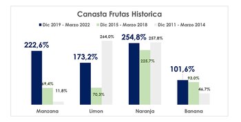 2 - En segundo lugar, tenemos a la canasta de frutas. El mayor aumento lo tuvo la naranja, con un 254%. Siguieron manzana (222%), limón (173%) y banana (101%). Ante esta situación, también se tomaron medidas desde los ministerios de Agricultura y Desarrollo Productivo: un fideicomiso para sostener el precio de las frutas, además se reforzará el control de precios en mercados centrales de cada municipio.