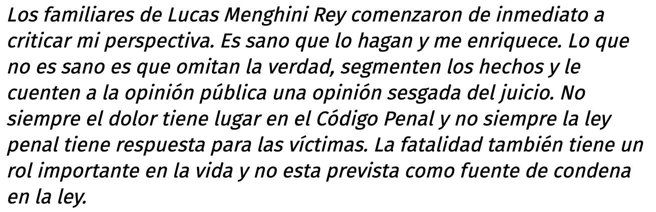 El lugar de las víctimas es horrible, y en la Argentina a las víctimas todo el mundo en general tiende a decirles que tienen razón. Y mi trabajo es horrible a veces, mi trabajo es ingrato. Yo a veces tengo que decirle a una víctima que no tiene razón desde mi humilde perspectiva.