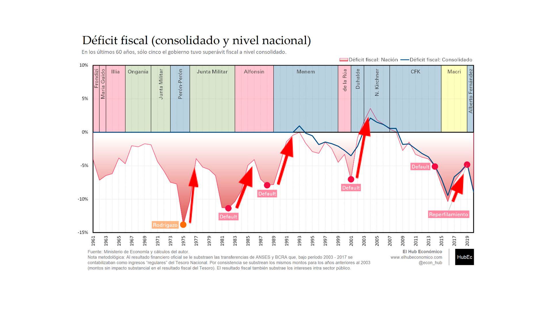 El siguiente gráfico puede ayudar a estudiar esta cuestión observando que cada vez que Argentina alcanzó altos niveles de déficit fiscal y logró revertirlos (a veces parcial y otras totalmente) fue necesaria una corrección cambiaria. Véanse las flechas rojas que apuntan hacia arriba.
