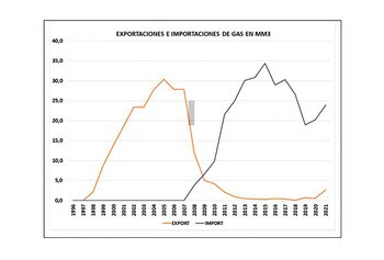 El gráfico muestra como entre 1997, cuando se privatizó el sistema energético, y 2005 hasta que Néstor Kirchner metió mano en las tarifas de los servicios públicos, aumentaban todo el tiempo las exportaciones y las importaciones de gas eran cero. La disparatada política de precios máximos para el gas hizo que se desplomaran las exportaciones a cero y se dispararan las importaciones de gas.
