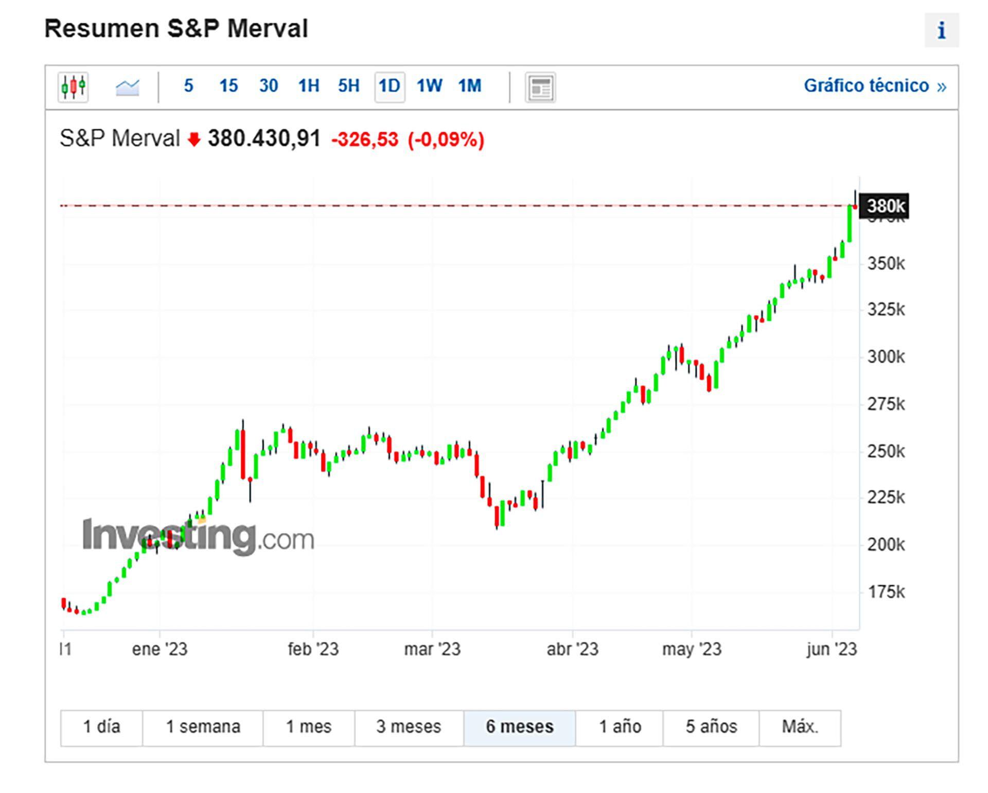 En el siguiente gráfico puede observarse como en el cuatrimestre transcurrido entre ambas notas, el valor del índice, medido en pesos, se ha incrementado en un 50%, desde un valor de 255.000 puntos en febrero, se ha desplazado hasta 380.000 en la actualidad.