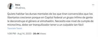De todas maneras, es un punto que muestra una estrategia acertada de esa fuerza y una estrategia errada -y vergonzosa- de quienes para oponerse a esa fuerza son más libertarios que los libertarios y esconden la agenda de género y diversidad sexual demonizando al feminismo que permitió cambios positivos y dejando que Milei no solo gane las elecciones sino la disputa electoral en donde los machistas popu-progresistas toman encantados el machismo liberal para correr a las mujeres, gays, lesbianas y trans del centro de la escena.