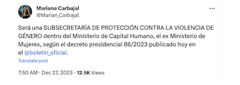 El presidente Javier Milei, a pesar de su furia antifeminista, mantiene, contra sus principios, (al menos en teoría) la idea de la lucha contra la violencia machista. El área del ya difunto Ministerio pasa a llamarse Subsecretaría de Protección contra la Violencia de Género. La Línea 144 y las políticas para prevenir femicidios van a quedar (entre tantas otras cosas) a cargo de Sandra Pettovello, en el Ministerio del todo poderoso Capital Humano.