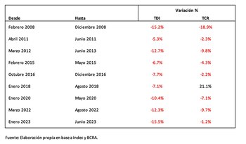 Otra manera simple de verificar la hipótesis de la flexibilidad cambiaria como amortiguadora de shocks en la Argentina es analizar que pasó desde 2008 con el TCR en los períodos en los que hubo caídas más pronunciadas en los TDI.