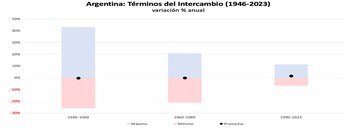 Teniendo en cuenta que la distribución y la magnitud de los shocks al TDI fue similar en ambos períodos, ceteris paribus, períodos de fuerte apreciación del peso (es decir, una fuerte caída del TCR) deberían haber sido más frecuentes entre abril de 1991 y diciembre de 2001 que entre enero de 2002 y noviembre de 2023. Como muestra el gráfico siguiente la serie de TDI anual muestra una distribución similar en ambos períodos:
