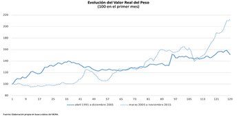 La evidencia también muestra algo que sorprenderá a algunos lectores: la apreciación del peso fue mayor entre marzo de 2005 y noviembre de 2015 que entre abril de 1991 y diciembre de 2001 (el valor real del peso es la inversa del TCR).