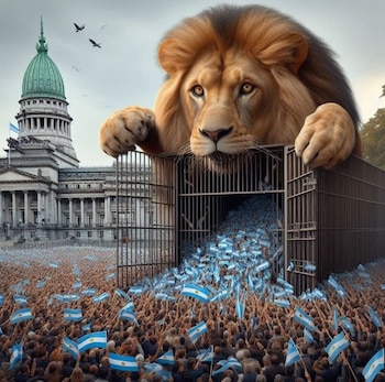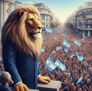 Tercer meme: El protagonista es, otra vez, ese poderoso felino, con su cabellera brillosa, sus ojos dorados, su mirada segura y calma. De fondo, se ve el Congreso de la Nación. Dos gaviotas merodean alrededor de su cúpula. Las multitudes -otra vez, millones de figuras pequeñitas con rostro impersonal- lo aclaman mientras agitan banderas argentinas. Él está parado sobre la avenida Rivadavia, sobre una gigantesca cárcel. Sus patas están posadas sobre los barrotes de sus puertas. A partir de aquí, hay un problema de interpretación. El verdadero Javier Milei posteó en Instagram el dibujo, con la leyenda: “Oid mortales el grito sagrado, libertad, libertad, libertad”, como si el león estuviera abriendo las puertas. Pero hay algo raro. Por momentos parece que los pigmeos están entrando en esa cárcel, disciplinados y mansos.