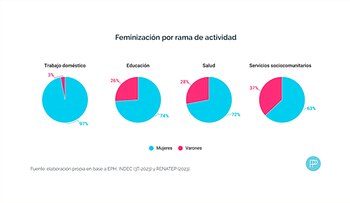 El servicio doméstico es el sector más feminizado (97%), con los niveles más altos de informalidad (73%) y con una de las remuneraciones más bajas de todo el mercado laboral. A su vez, en salud y educación, las mujeres presentan mayores niveles de informalidad que los varones (4 p.p. y 1 p.p., respectivamente).