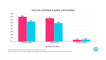 Es usual escuchar que los varones “trabajan” más que las mujeres. Esta percepción parte de una realidad que se observa en el mercado laboral, dado que ellos presentan mayores tasas de actividad (82% vs 66%), mayores niveles de empleo (77% vs 61%) y menores tasas de desempleo (5.7% vs 6.6%).