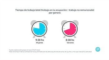 Entonces, ¿quiénes trabajan más: los varones o las mujeres? Afortunadamente, la ENUT nos permite responder con datos. Si se considera el total de horas por día que se dedican al trabajo remunerado y no remunerado, las mujeres tienen una carga horaria promedio de 9:20 horas, por encima de las 8:38 horas de los varones.