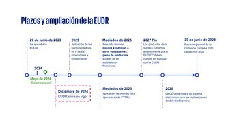 De acuerdo con el cronograma establecido por la Unión Europea, el 1 de enero de 2025 empezará a aplicarse el Reglamento Europeo Sobre Productos Libres de Deforestación (EUDR) de la ley sancionada en 2023 que limita la importación de productos que procedan de zonas recientemente deforestadas. Abarca, en una primera etapa, a carnes, soja, madera, cacao, caucho, café y aceite de palma provenientes de regiones desmontadas. La ley también incluye a los derivados de estos productos, como chocolates o muebles. Europa no aceptará productos que procedan de tierras deforestadas ni que hayan provocado deforestación después del 31 de diciembre de 2020. De este modo, de ahora en más, las empresas tendrán que demostrar que sus productos cumplen la legislación del país de origen.