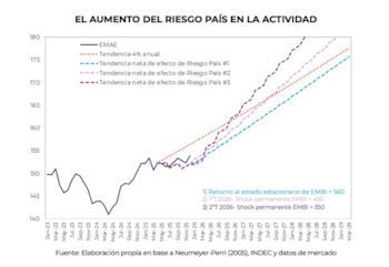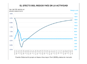 Por suerte todo eso sabemos cómo computarlo. El modelo canónico para hacerlo deviene de un celebrado trabajo del economista argentino Andrés Neumeyer (Neumeyer-Perri, Business cycles in emerging economies, the role of interest rates, JME, 2005) que calibra un modelo de equilibrio general, con optimización intertemporal, en una economía abierta, donde el factor relevante que analiza es el efecto del riesgo país y como afecta a la financiación de la inversión y los costos de producción. El resultado del modelo de Neumeyer-Perri para el aumento del riesgo kuka en 2025 da como resultado la curva que adjuntamos en el siguiente gráfico. Predice una caída de hasta 3.2% del PBI (parecido a lo que daba el análisis previo), que persiste en el tiempo por su efecto en la inversión.