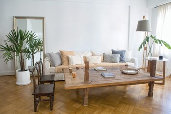 El living es bien ecléctico, con un sillón de tres cuerpos con funda de tusor crudo y almohadones variados (Sin Almidón) y una mesa de madera rústica de Indonesia (Desde Asia) decorada con una bandeja de metal espejada (Sentido). Un par de sillas chinas se les suman de lado, junto a un macetero con palmera que se refleja en un espejo de alpaca (Paul Deco). Se les une junto al ventanal una mesa con tapa redonda de Carrara y patas de incienso (Falabella) y una lámpara con pantalla de lino gris (La Charrúa). Dónde lo consigo. Esta encantadora pareja de sillas bajas en madera de olmo tiene el sello de la deco chinesse (Desde Asia). A su lado, la superficie rústica de la mesa baja suma dos velas de cobre (Sentido).
