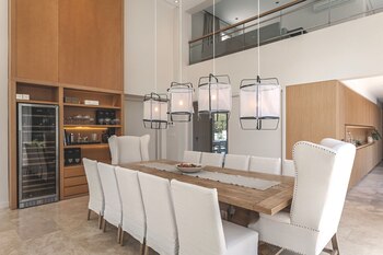 Integrado al living, el comedor ofrece un mueble de piso a techo en madera de roble con iluminación embutida de tiras de led que hace las veces de vajillero y bar. Suma cajones, estantes, lugar de guardado y un nicho en el que se colocó una cava. La enorme mesa es de petiribí macizo y en las cabeceras hay dos sillones individuales estilo Bergère tapizados en lino y con detalle de tachas de tapicería. El resto de las sillas tiene funda de lino, lo que las hace más prácticas a la hora del lavado y mantenimiento. Las lámparas tipo farol de hierro y lienzo que cuelgan a distintas alturas aportan su toque etéreo y refuerzan con luz puntual la iluminación general de los artefactos embutidos en el cielorraso (Susana Villaverde).