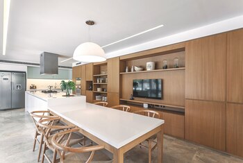 La cocina y el comedor diario forman un gran ambiente conectado por la isla revestida en Silestone Blanco Zeus y por la mesa en ese mismo material, que le da continuidad, como si se tratara de una sola pieza. Las patas son de roble macizo y comulgan con el color de las sillas Wishbone con asiento de mimbre (Amparo be). Para la zona de trabajo y cocción se diseñaron muebles laqueados en blanco mate y vidrio esmerilado. En contraste, un gran mueble bifaz realizado en roble (diseño del estudio de Judith Babour) se ofrece como espacio de guardado, a la vez que marca una separación visual entre la cocina propiamente dicha y el comedor de diario.