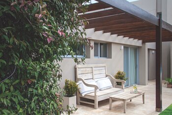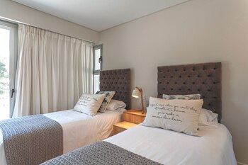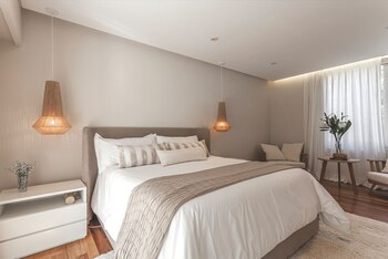 La suite principal tiene una cama doble con respaldo curvo vestido con funda de lino lavado en tono cemento, diseño del estudio. Las mesas de luz son de madera laqueada color crudo y van acompañadas de unas lámparas colgantes modelo Kiaro, de estructura de metal anodizado recubierta con hilado a mano con yute de Pakistán (Estudio Doble A EDA). Para la ropa de cama se optó por el color blanco, con un pie de cama tejido y almohadones (Gutiérrez Deco). A los pies, se extiende una alfombra color crudo de pelo corto (Kalpakian).