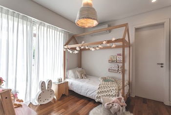 El cuarto de la más pequeña es de cuentos: los muebles son del tamaño de su usuaria y los accesorios y detalles están sobredimensionados. La cama de madera con dosel suma un detalle lúdico; la acompaña una mesa de luz que es, a su vez, un baúl para guardar juguetes, y una lámpara de chapa Miffi con forma de la cabeza de un conejo (todo de Lila Casa Deco). La iluminación está a cargo de una guirnalda de flores y una lámpara colgante de lana modelo Vellón (Flo's Market).