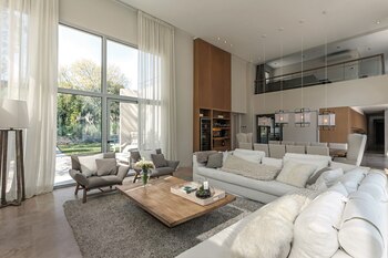 En el living comedor, la doble altura tiene su efecto, que resulta acentuado por las larguísimas cortinas de lino crudo (Littleshade) que van de piso a techo. Sobre el imponente piso de mármol travertino, una alfombra de pelo largo (Kalpakian) le da contención a los muebles que componen el estar: un sofá esquinero XL tapizado en lino (Estudio Judith Babour) con almohadones de distintos tejidos (Paul French Gallery), una gran mesa de centro de petiribí macizo y dos sillones escandinavos (Estudio Judith Babour) en pana lavada (De Levie) y con patas de roble.