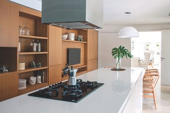 Dos rajas perimetrales de luz atraviesan y unen ambos espacios, mientras que sobre la mesa pende una gran lámpara colgante de vidrio blanco (Iluminación Agüero). Sobre el anafe de cinco hornallas (Ariston) cae una campana de acero inoxidable (Llanos). El gran mueble de guardado le da contención de este lado al horno, el microondas y la tevé; del lado opuesto, también colabora con el orden.
