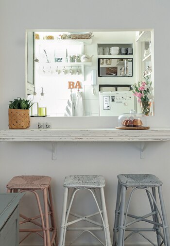 Para armar esta ventana a modo de pasante se sacrificó una alacena que cubría esa pared de la cocina. La barra se materializó con un estante recuperado y unas maderas decapé. Acompañan tres banquetas vintage pintadas con aerosol en gris, rosa y blanco (Rust-Oleum). popurrí de marcos.