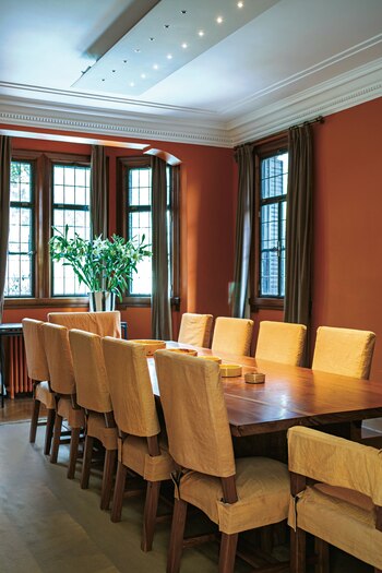 En el living y el comedor se eligió una ambientación más clásica y sencilla que no desentone con la estructura original. En el comedor se combinó una mesa –para doce personas– en madera de lapacho encerado y sillas de lapacho con fundas en tusor. En el clásico bow window se acomodó una mesa china de hierro actualizada con un florero rayado en blanco y negro.