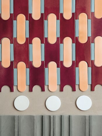Una familia encantadora de azulejos que van desde tonos rosados hasta grises, negros y verde menta, con una variedad de piezas de geometría y bajorrelieves de distintos tamaños y combinaciones muestra un uso completamente innovador de este material que explora el límite sutil entre la artesanía y el diseño.