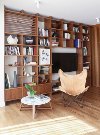 En el familyroom, la biblioteca de incienso (GGYA) es la gran protagonista. Una obra de Cecilia Borghi, un sillón BKF de suela (Newton) y una mesa de mármol con patas de incienso (GGYA) son algunos de los objetos que le otorgan personalidad al espacio.