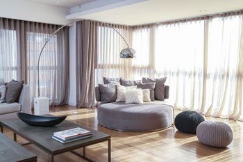 En el family se armó un comedor diario y espacio de trabajo con una mesa Tulip de Saarinen (Manifesto), sillas Eames (Deco Design) y un centro de mesa de cerámica blanco (Amma). Una lámpara colgante (Disegno 3) completa el cuadro. Las cortinas de gasa traslúcida (géneros de Compañía de Comercio y diseño de Abax Decoraciones) completan el ambiente, en el que el único color lo da el piso de parquet de madera (Golf).
