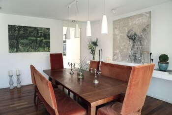 Apostando nuevamente por el contraste, unos candelabros de plata heredados dialogan con unas lámparas colgantes de porcelana (Iluminación Agüero) y obras contemporáneas.
