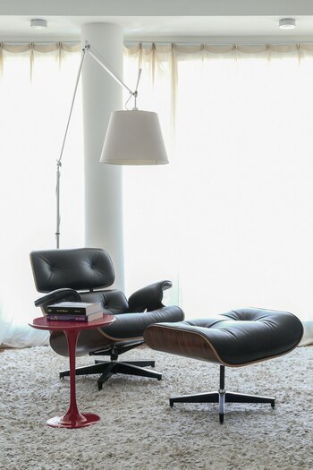 xUna lámpara Tolomeo, una mesa tulip y un sillón Eames dan forma a este rincón de lectura bien moderno al costado de la biblioteca.