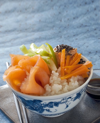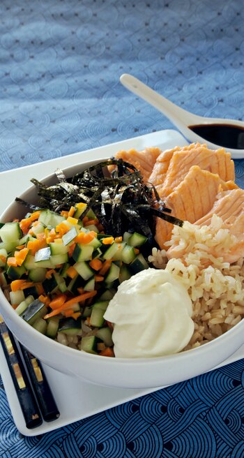 Ingredientes (para 4 porciones): para el arroz: 1 y ½ tazas de arroz yamaní o integral común; 2 cdas. de vinagre de arroz o de manzana; 1 cda. de azúcar; ½ cdta. de sal. El resto de los alimentos: 400 g de salmón rosado crudo; 2 cdas. de aceite de oliva; 2 cdas. de mayonesa; 2 cdas. de de yogur natural; 2 cdas. de queso crema; 1 pepino cortado en cubitos; 1 zanahoria cortada en cubitos y hervida; 1 hoja de alga nori cortada en tiritas; 3 cdas. de salsa de soja; 2 cdas. de jugo de naranja; 1 cda. de jugo de limón y 1 cda. de azúcar. Preparación: herví el arroz en abundante agua. Cuando esté cocido, escurrí y aún caliente agregale el vinagre con el azúcar y la sal. Mezclalo y colocalo en una bandeja, dejá enfriar esparciéndolo con un tenedor. Una vez frío, tapá con film transparente. Cortá el salmón en fetas finas, doralo en aceite de oliva, condimentá con sal y pimienta y reservá. Mezclá la mayonesa con el yogur y el queso crema, reservá. Mezclá el pepino con las zanahorias recién hervidas y dejá enfriar. Colocá el arroz frío en 4 bowls. Sobre el arroz distribuí las fetas de salmón, la mezcla de pepino y zanahorias, las tiritas de alga y la preparación de mayonesa.