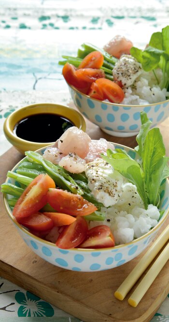 Ingredientes (para 4 porciones): 1 receta de arroz base cocido y frío; 350 g de lenguado o brótola; 2 cdas. de aceite de oliva; 2 cdas. de sal gruesa; 2 cdas. de azúcar; pimienta negra recién molida; 150 g de chauchas planas hervidas en agua y sal; 16 tomates cherry; 4 cdas. de queso crema; 1 manojo de rúcula y salsa de soja para acompañar. Preparación: cortá el pescado en cubos chicos, colocá en un bowl, agregá el aceite, la sal, el azúcar y pimienta negra. Mezclá y dejá marinar 30' en la heladera. Pasalo por agua fría para retirarle el excedente de sal y azúcar. Escurrilo bien. Distribuí el arroz en 4 bowls, disponé sobre el arroz los cubos de pescado, las chauchas cortadas en juliana y los tomatitos cortados. Agregá el queso crema y más pimienta a gusto. Acompañá con la rúcula y la salsa de soja.