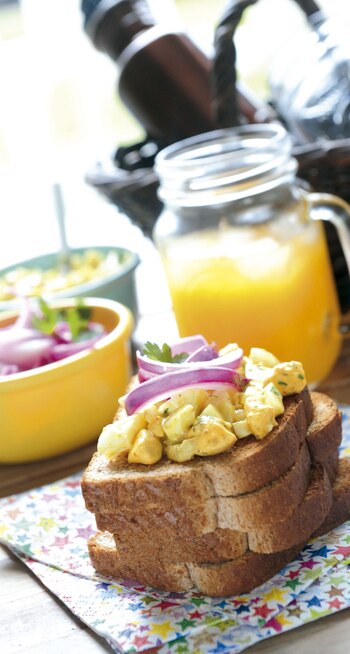 Ingredientes (para 4 porciones): para los pickles de cebolla: 2 tazas de agua hirviendo; 1 cdta. de miel; ½ cdta. de sal; 3/4 taza de vinagre blanco y 1 cebolla morada cortada en gajos finos. Además, 6 huevos duros; 1 cda. de cebolla picada; 2 cdas. de mostaza; 2 cdtas. de mayonesa; 2 cdtas. de curry; ¼ taza de perejil picado; sal y pimienta; 4 tajadas de pan integral (puede ser pan sin gluten); 1 ramito de perejil para decorar y pickles a gusto. Preparación: para los pickles: mezclá en un bowl grande el agua con la miel, la sal y el vinagre. Poné las cebollas en un frasco y llená con la mezclá de agua y vinagre. Dejá a temperatura ambiente durante una hora y llevá a la heladera. Por otra parte, picá los huevos duros algo gruesos. Colocá en un bowl y agregale la cebolla picada, la mostaza, la mayonesa, el curry, el perejil, sal y pimienta. Tostá cuatro tajadas de pan integral, distribuí la preparación de huevo, agregá los pickles de cebolla y ramitas de perejil.