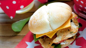 Ingredientes (para 4 sándwiches): 3 cdas. de aceite de oliva; sal y pimienta; 1 cda. de perejil picado; 1 cda. de orégano fresco picado; 2 cdtas. de mostaza; 2 cdtas. de azúcar; ¼ taza de agua; 2 supremas sin piel ni huesos; 4 panes de hamburguesa; 2 tomates; 1 ramo de rúcula; 8 fetas de queso cheddar y 4 cdas. de queso crema. Preparación: mezclá los ingredientes de la marinada. Cortá las pechugas en fetas, colocalas en un bowl, rociá con la marinada, mezclá y deja 30' en la heladera. Escurrilas y doralas a la sartén, mojándolas con la marinada y más agua –si hiciera falta– hasta que estén cocidas. Dejalas enfriar en el jugo de cocción. Cortá los panes, tostalos, untá con el queso crema, sal y pimienta. Armá los sándwiches alternando fetas de pollo con tajadas de tomates, el queso y hojas de rúcula.