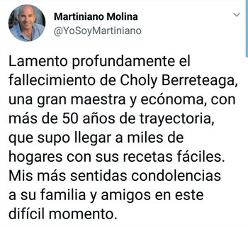 Generaciones consagradas de cocineros le rinden su homenaje: para Fernando Trocca "Choly sin dudas fue una de las popes de la cocina en la televisión argentina. Le dejó mucho a las amas de casa. Sus programas estaban dirigidos a esas personas que querían cocinar todos los días. Fue un ícono y dejó un legado eterno", afirma.