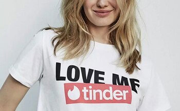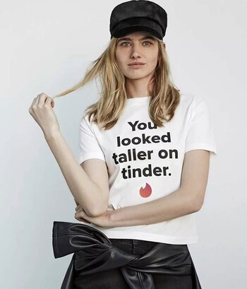Las remeras en blanco y negro llevan impresas las frases conocidas por los usuarios -"Swipe" y "Love Me"- con una dosis de humor particular: "You looked taller on Tinder" (parecías más alto en Tinder).