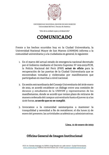 Más temprano, la UNMSM manifestó que la policía nacional actuó de oficio durante el desalojo de manifestantes que permanecían dentro de la casa de estudios, debido a que incumplieron el acuerdo que les permitía quedarse únicamente hasta el jueves 19 de enero.