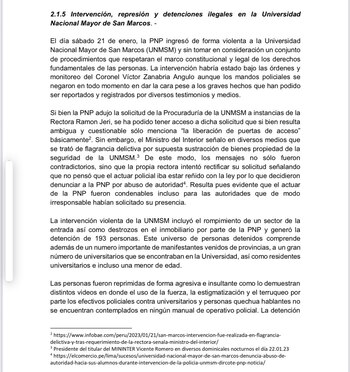 Finalmente, se destaca que, para los fines policiales anteriormente mencionados, “se mancilló el honor de casi dos centenares de peruanos y se puso en riesgo su integridad”. Del mismo modo, según presume la denuncia, “se dañó de modo grave el patrimonio de la UNMSM que es la Decana de América, símbolo de la universidad pública y símbolo cultura e intelectual de nuestro país”.