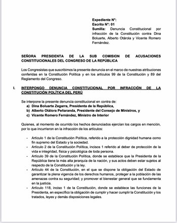Boluarte Zegarra no es la única funcionaria pública comprendida en esta denuncia. Según el expediente, el Presidente del Consejo de Ministros, Alberto Otárola Peñaranda; y el ministro del Interior, Vicente Romero Fernández, también fueron incluidos en el recurso legal.