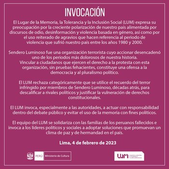 El Lugar de la Memoria, la Tolerancia y la Inclusión Social (LUM) se solidarizó con las familias de los peruanos fallecidos e invoca a los líderes políticos y sociales a adoptar soluciones que promuevan un clima de paz y de hermandad en el país.