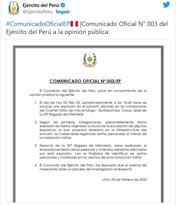 Luego de unos minutos, el área de imagen del Ejército del Perú, emitió un comunicado explicando lo ocurrido. También se conoció que tras este estallido, hubo 11 heridos leves y casas aledañas afectadas.