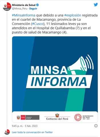 “Minsa Informa que debido a una explosión registrada en el cuartel de Macamango, provincia de La Convención (Cusco), 11 lesionados leves ya son atendidos en el Hospital de Quillabamba (7) y en el puesto de salud de Macamango (4)”, escribió el organismo en su cuenta oficial de Twitter.