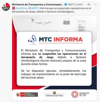 Atención a todas las personas que tenían planeado viajar a la ciudad de Jauja y es que el Ministerio de Transporte y Comunicaciones dio a conocer que temporalmente se suspenden las operaciones en el aeropuerto de esa localidad por factores climatológicos.