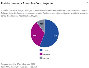 Pese al desconocimiento, el señalado estudio de Datum también reportó que un 56% de peruanos está de acuerdo con la instalación de esta asamblea. Del lado contrario, un 34% se manifestó en contra y un 10% pasó a las filas de “no sabe”.