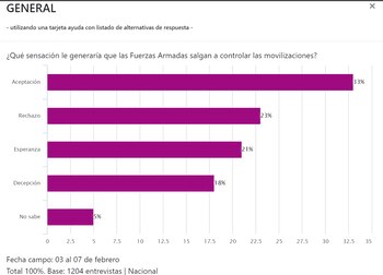 El estudio se realizó entre el tres y el siete de febrero, con una base de 1204 entrevistas a nivel nacional. A la pregunta “¿Qué sensación le generaría que las Fuerzas Armadas salgan a controlar las movilizaciones?”, se registró que un 33% expresa “aceptación” por la medida. Del lado contrario, mientras tanto, se tiene a un 23% que rechaza esta posible acción.