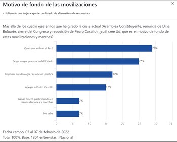 Al respecto, un 29% aseguró que se “quiere cambiar al Perú”, mientras que un 25% contestó “exigir mayor presencia del Estado”. Otros grupos contestaron “imponer su ideología/opción política” (17%); “apoyar a Pedro Castillo” (15%) y “ganar dinero participando en manifestaciones y marchas” (7%).