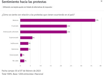 Además, se pudo reportar que un 37% de personas se encuentra “molesto” con las protestas “que vienen ocurriendo en el país”. Un 23% asegura sentirse “frustrado”, el mismo sector “amenazado/afectado”, 6% “esperanzado”, y otro 4% “optimista”.